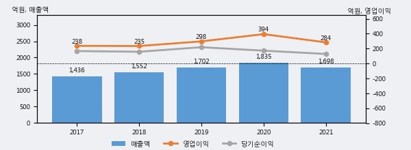 JW생명과학의 2021년 매출액은 1698억으로 전년대비 -7.5% 하락했고, 영업이익 역시 284억으로 전년대비 -28.0% 하락했다. 이 회사의 매출액 증감률과 영업이익 증감률은 각각 코스피 하위 10%, 하위 23%에 해당된다.