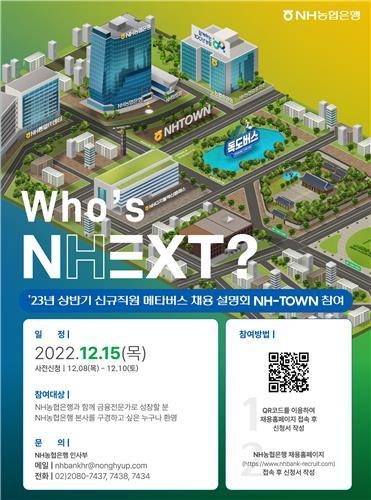 NH농협은행은 채용 메타버스 플랫폼인 'NH TOWN'을 통해 채용정보 등 다양한 콘텐츠를 제공하며, 오는 15일에는 메타버스 채용설명회도 개최한다.