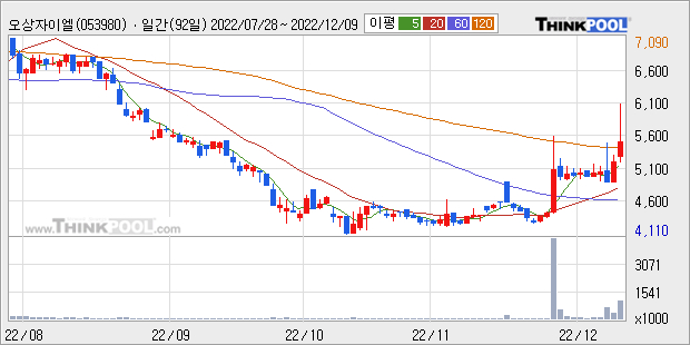 오상자이엘의 2021년 매출액은 전년대비 31.2% 늘어난 905억원이고, 영업이익은 흑자전환해서 54억원을 기록했다. 이 회사의 매출액 증감률과 영업이익 증감률은 각각 코스닥 상위 25%, 상위 14%에 해당된다.