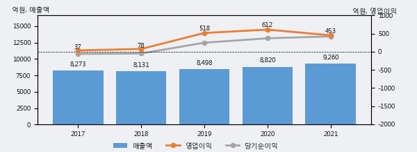 동성케미컬의 2021년 매출액은 전년대비 5.0% 늘어난 9260억원이고, 영업이익은 전년대비 -25.9% 줄어든 453억원을 기록했다. 이 회사의 매출액 증감률과 영업이익 증감률은 각각 코스피 하위 30%, 하위 23%에 해당된다.