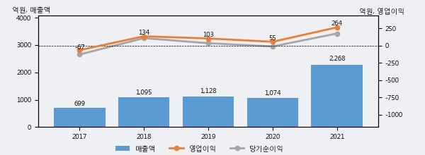 최근 실적을 살펴보면 2021년 매출액이 최근 5년 중 가장 높은 실적을 기록했음을 알 수 있다. 이전 최고 실적이었던 2019년 보다도 101.1%(1140억 1천만원) 늘어난 것으로 나타났다.