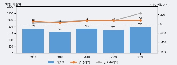 최근 실적을 살펴보면 2021년 매출액이 최근 5년 중 가장 높은 실적을 기록했음을 알 수 있다. 이전 최고 실적이었던 2019년 보다도 5.3%(39억원) 늘어난 것으로 나타났다.
