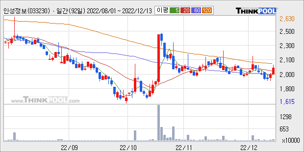 인성정보는 2021년 매출액 2583억원과 영업이익 20억원을 기록했다. 전년대비 매출은 6.7% 상승했고, 영업이익은 -31.4% 하락했다. 이 회사의 매출액 증감률과 영업이익 증감률은 각각 코스닥 하위 37%, 하위 28%에 해당된다.