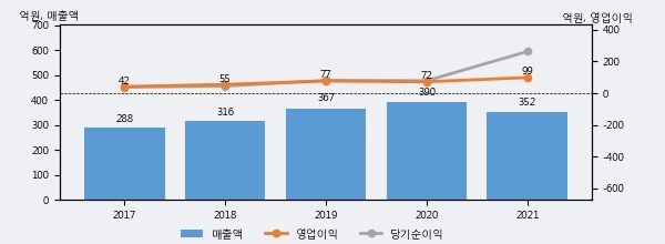 이엠넷의 2021년 매출액은 전년대비 -9.7% 줄어든 352억원이고, 영업이익은 전년대비 36.7% 늘어난 99억원을 기록했다. 이 회사의 매출액 증감률과 영업이익 증감률은 각각 코스닥 하위 16%, 상위 43%에 해당된다.