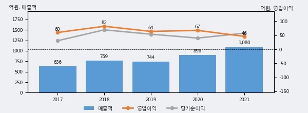최근 실적을 살펴보면 2021년 매출액이 최근 5년 중 가장 높은 실적을 기록했음을 알 수 있다. 이전 최고 실적이었던 2020년 보다도 20.5%(183억 3천만원) 늘어난 것으로 나타났다.