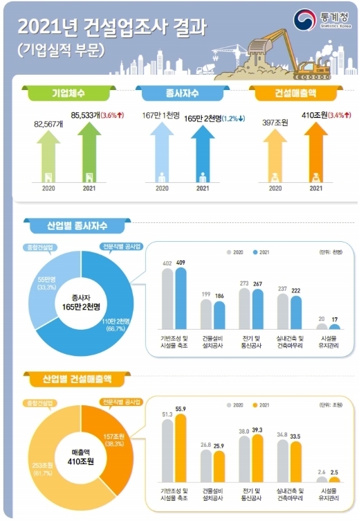 종합건설업 기업체 수는 1만2399개로 4.3%(507개) 증가, 전문직별 공사업 기업체 수는 7만3134개로 3.5%(2459개) 늘었다. 종합건설업 종사자 수는 55만명으로 1.9%(1만명) 증가, 전문직별 공사업 종사자 수는 110만2000명으로 2.6%(2만9000명) 줄었다.