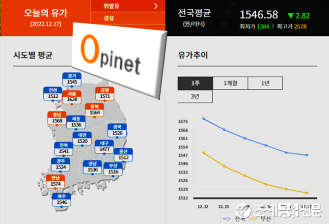 17일 한국석유공사 유가정보시스템 오피넷에 따르면 12월 둘째 주(11∼15일) 전국 주유소 휘발유 평균 판매가격은 L(리터)당 1천568.9원으로 전주보다 42.2원 내렸다.