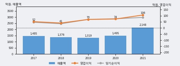 최근 실적을 살펴보면 2021년 매출액이 최근 5년 중 가장 높은 실적을 기록했음을 알 수 있다. 이전 최고 실적이었던 2020년 보다도 43.7%(653억 2천만원) 늘어난 것으로 나타났다.