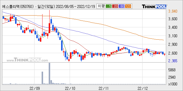 에스폴리텍은 2021년 매출액 1098억원과 영업이익 46억원을 기록했다. 전년대비 매출은 -18.8%, 영업이익은 -67.7% 각각 하락했다. 이 회사의 매출액 증감률과 영업이익 증감률은 각각 코스닥 하위 11%, 하위 19%에 해당된다.
