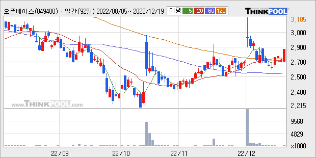 오픈베이스의 2021년 매출액은 전년대비 13.0% 늘어난 1759억원이고, 영업이익 또한 전년대비 47.5% 늘어난 54억원을 기록했다. 이 회사의 매출액 증감률과 영업이익 증감률은 각각 코스닥 하위 50%, 상위 39%에 해당된다.
