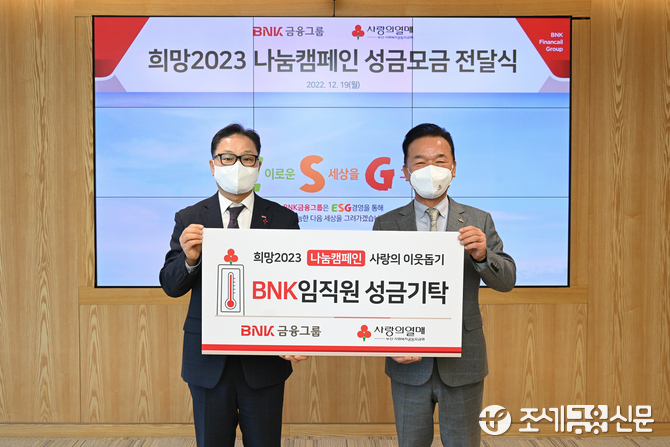 BNK금융그룹은 19일 BNK금융지주와 부산은행, 각 계열사 임직원의 자발적 참여(임직원 급여공제, 회사 기부금)로 조성한 이웃사랑 성금 1억원을 부산사회복지공동모금회 '희망 2023 나눔캠페인'에 전달했다고 밝혔다.