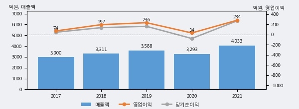최근 실적을 살펴보면 2021년 매출액이 최근 5년 중 가장 높은 실적을 기록했음을 알 수 있다. 이전 최고 실적이었던 2019년 보다도 12.4%(445억 3천만원) 늘어난 것으로 나타났다.