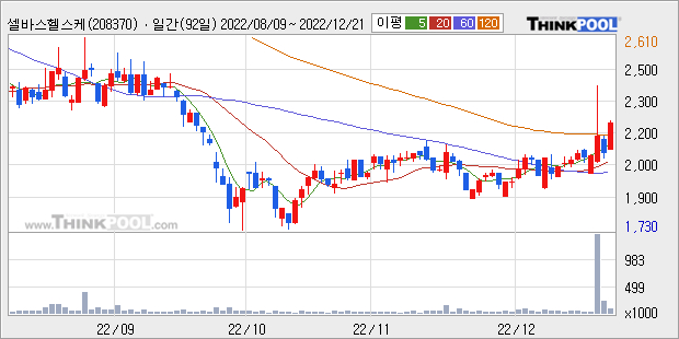 일봉 차트의 모습은 현재 단기·중기 이평선이 정배열 상태로 전형적인 상승세를 보이고 있다. 이 종목의 차트에서 최근에 최근 60일 매물대 돌파, 최근 5일 매물대 돌파, 주가 5MA 상향돌파 등을 확인할 수 있다
