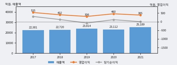 최근 실적을 살펴보면 2021년 매출액이 최근 5년 중 가장 높은 실적을 기록했음을 알 수 있다. 이전 최고 실적이었던 2019년 보다도 5.8%(1374억 5천만원) 늘어난 것으로 나타났다.