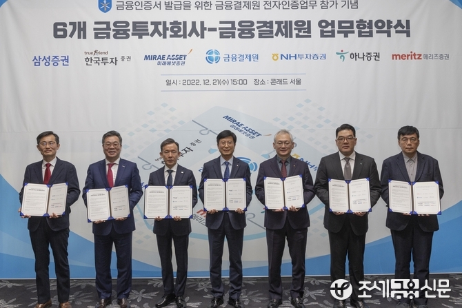 (조세금융신문=최주현 기자) 금융결제원은 서울 여의도 콘래드 호텔에서 6개 증권사와 '금융인증서 발급 및 상호협력을 위한 업무협약'을 체결했다고 21일 밝혔다.