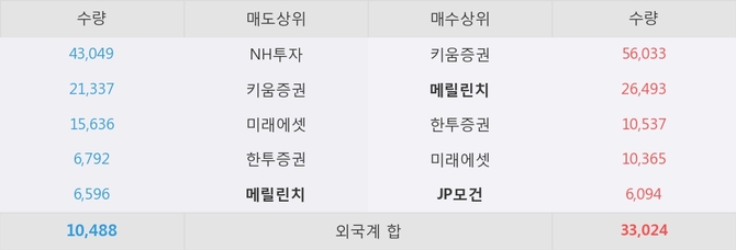 거래원 동향은 메릴린치, JP모건, 미래에셋 등이 매수 상위 목록에 위치하고 있다. 한편, 매도 창구 상위에는 메릴린치가 눈에 띄고 있다.