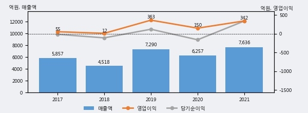 최근 실적을 살펴보면 2021년 매출액이 최근 5년 중 가장 높은 실적을 기록했음을 알 수 있다. 이전 최고 실적이었던 2019년 보다도 4.7%(345억 3천만원) 늘어난 것으로 나타났다.