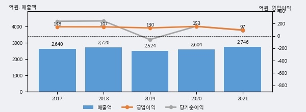 최근 실적을 살펴보면 2021년 매출액이 최근 5년 중 가장 높은 실적을 기록했음을 알 수 있다. 이전 최고 실적이었던 2018년 보다도 1.0%(26억원) 늘어난 것으로 나타났다.