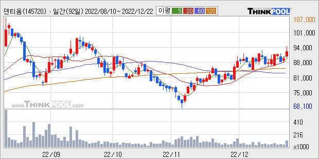 덴티움의 2021년 매출액은 전년대비 26.9% 늘어난 2915억원이고, 영업이익 또한 전년대비 76.5% 늘어난 699억원을 기록했다. 이 회사의 매출액 증감률과 영업이익 증감률은 각각 코스피 상위 26%, 상위 32%에 해당된다.