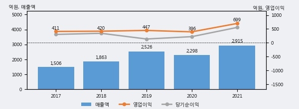 최근 실적을 살펴보면 2021년 매출액이 최근 5년 중 가장 높은 실적을 기록했음을 알 수 있다. 이전 최고 실적이었던 2019년 보다도 15.4%(389억 4천만원) 늘어난 것으로 나타났다.