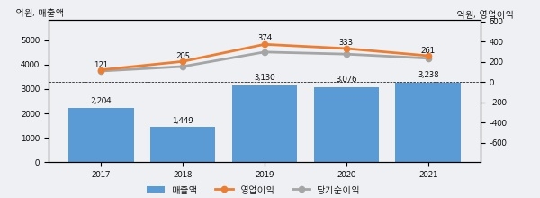 최근 실적을 살펴보면 2021년 매출액이 최근 5년 중 가장 높은 실적을 기록했음을 알 수 있다. 이전 최고 실적이었던 2019년 보다도 3.5%(108억 2천만원) 늘어난 것으로 나타났다.