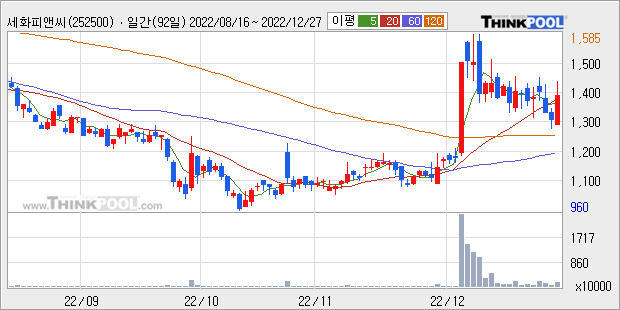 세화피앤씨의 2021년 매출액은 전년대비 8.4% 늘어난 397억원이고, 영업이익 또한 전년대비 4.2% 늘어난 54억원을 기록했다. 이 회사의 매출액 증감률과 영업이익 증감률은 각각 코스닥 하위 40%, 하위 42%에 해당된다.