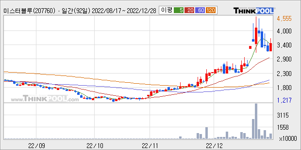 미스터블루는 2021년 매출액 614억원과 영업이익 68억원을 기록했다. 전년대비 매출은 -23.8%, 영업이익은 -53.0% 각각 하락했다. 이 회사의 매출액 증감률과 영업이익 증감률은 각각 코스닥 하위 9%, 하위 23%에 해당된다.