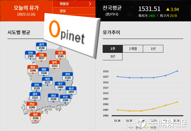 31일 한국석유공사 유가정보시스템 오피넷에 따르면 12월 넷째 주(25∼29일) 전국 주유소 휘발유 평균 판매가격은 L(리터)당 1천526.9원으로 전주보다 10.4원 하락했다.