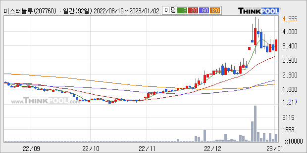 미스터블루의 2021년 매출액은 614억으로 전년대비 -23.8% 하락했고, 영업이익 역시 68억으로 전년대비 -53.0% 하락했다. 이 회사의 매출액 증감률과 영업이익 증감률은 각각 코스닥 하위 9%, 하위 23%에 해당된다.