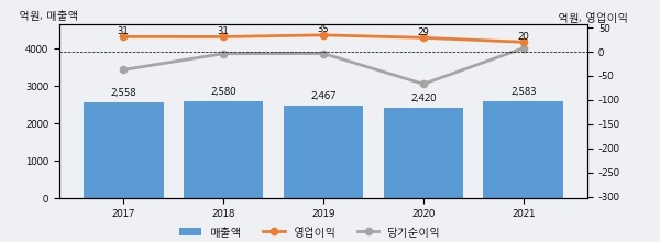 최근 실적을 살펴보면 2021년 매출액이 최근 5년 중 가장 높은 실적을 기록했음을 알 수 있다. 이전 최고 실적이었던 2018년 보다도 0.1%(2억 8천만원) 늘어난 것으로 나타났다.