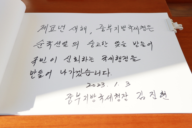 김 중부청장은 방명록에 “계묘년 새해, 중부지방국세청은 순국선열의 숭고한 뜻을 받들어 국민이 신뢰하는 국세행정을 만들어 나가겠습니다”고 기록했다.