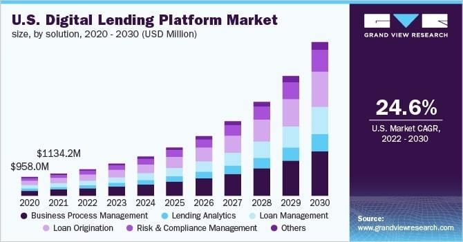 Grand view research 자료에 따르면 글로벌 디지털 대출 플랫폼 시장의 규모는 2021년 미국 화폐 기준으로 58억 4,000만 달러를 기록했고, 2022년부터 2030년까지의 연평균 성장률(CAGR)이 24.6%를 기록할 것으로 예상된다. 또한 S&P Global의 핀테크 대출 실적 전망 자료에 따르면 핀테크 대출 유형인 모기지, 학자금대출, 소기업 대출, 개인대출 등 모든 부문에서 50% 이상의 성장세를 예상했을 정도로 핀테크는 미래 대출 사업에 있어서 빼놓을 수 없는 혁신적인 트렌드로 부상하고 있다.
