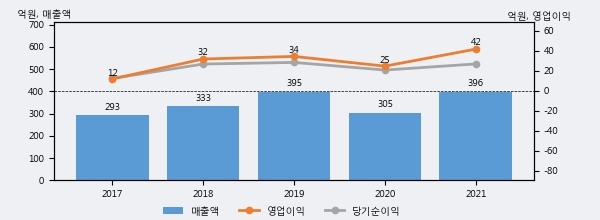 최근 실적을 살펴보면 2021년 매출액이 최근 5년 중 가장 높은 실적을 기록했음을 알 수 있다. 이전 최고 실적이었던 2019년 보다도 0.1%(3천만원) 늘어난 것으로 나타났다.