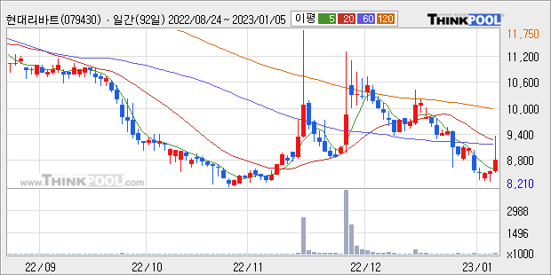 일봉 차트의 모습은 단기 이평선이 중기 이평선 아래에 놓인 역배열 구간으로, 주가가 반등을 시도하는 모습이다. 이 종목의 차트에서 최근에 캔들패턴(상승반전형), 주가 5MA 상향돌파 등을 확인할 수 있다
