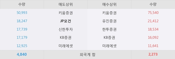 이 시각 주요 거래원은 미래에셋, 키움증권, 유진증권 등이 매수 상위 창구에 자리하고 있다. 한편, 매도 창구 상위에는 JP모건이 눈에 띄고 있다.