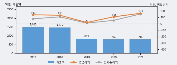 최근 3년간의 실적을 살펴보면, 매출액은 3년 연속 하락하고 있으나 그 하락폭은 줄어들고 있음을 알 수 있다.