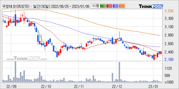 구영테크의 2021년 매출액은 전년대비 3.4% 늘어난 2034억원이고, 영업이익 또한 전년대비 35.7% 늘어난 40억원을 기록했다. 이 회사의 매출액 증감률과 영업이익 증감률은 각각 코스닥 하위 32%, 상위 43%에 해당된다.