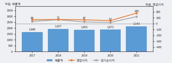 최근 실적을 살펴보면 2021년 매출액이 최근 5년 중 가장 높은 실적을 기록했음을 알 수 있다. 이전 최고 실적이었던 2018년 보다도 11.2%(214억 9천만원) 늘어난 것으로 나타났다.