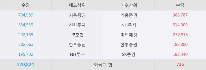 거래원 동향은 NH투자, 미래에셋 등이 매수 상위 목록에 나타나고 있다. 한편, 매도 창구 상위에는 JP모건이 눈에 띄고 있다.