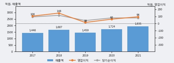 최근 실적을 살펴보면 2021년 매출액이 최근 5년 중 가장 높은 실적을 기록했음을 알 수 있다. 이전 최고 실적이었던 2020년 보다도 12.2%(210억 8천만원) 늘어난 것으로 나타났다.