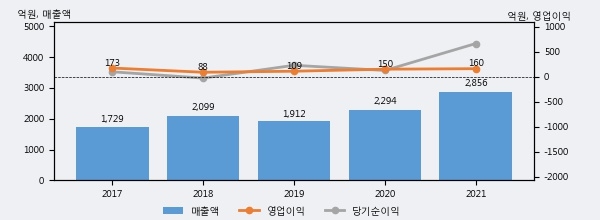 최근 실적을 살펴보면 2021년 매출액이 최근 5년 중 가장 높은 실적을 기록했음을 알 수 있다. 이전 최고 실적이었던 2020년 보다도 24.5%(561억 3천만원) 늘어난 것으로 나타났다.