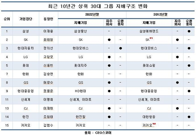 CEO스코어는 주요 그룹 대부분 지배구조 개편을 통해 고질병인 순환출자 구조에서 벗어났다면서 최근 10년간 삼성, 현대차, 롯데, HD현대, 한진, DL, 중흥건설, 현대백화점, 금호아시아나, HDC, 영풍 등 11개 기업이 만성 순환출자 상태였지만, 2022년 말 현대차그룹을 제외하고 모두 해소했다고 전했다.