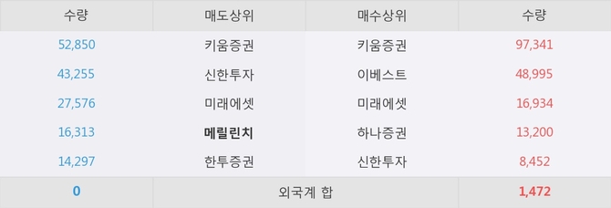 이 시각 주요 거래원은 미래에셋, 키움증권, 이베스트 등이 매수 상위 창구에 자리하고 있다. 한편, 매도 창구 상위에는 메릴린치가 눈에 띄고 있다.