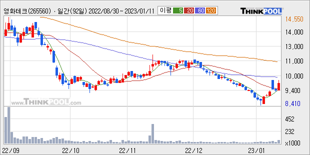 영화테크는 2021년 매출액 406억원과 영업이익 23억원을 기록했다. 전년대비 매출은 15.9%, 영업이익은 3,214.3% 각각 상승했다. 이 회사의 매출액 증감률과 영업이익 증감률은 각각 코스닥 상위 46%, 상위 1%에 해당된다.
