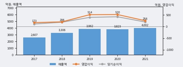 최근 실적을 살펴보면 2021년 매출액이 최근 5년 중 가장 높은 실적을 기록했음을 알 수 있다. 이전 최고 실적이었던 2019년 보다도 3.6%(140억원) 늘어난 것으로 나타났다.