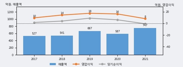 최근 실적을 살펴보면 2021년 매출액이 최근 5년 중 가장 높은 실적을 기록했음을 알 수 있다. 이전 최고 실적이었던 2019년 보다도 12.1%(80억 8천만원) 늘어난 것으로 나타났다.