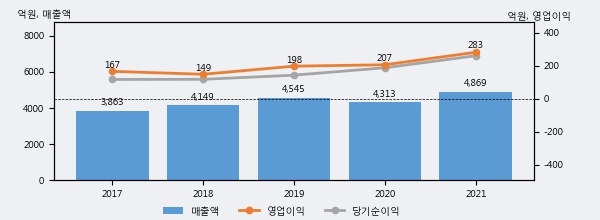 최근 실적을 살펴보면 2021년 매출액이 최근 5년 중 가장 높은 실적을 기록했음을 알 수 있다. 이전 최고 실적이었던 2019년 보다도 7.1%(324억 3천만원) 늘어난 것으로 나타났다.