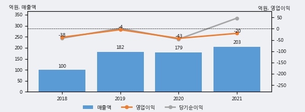 최근 실적을 살펴보면 2021년 매출액이 최근 4년 중 가장 높은 실적을 기록했음을 알 수 있다. 이전 최고 실적이었던 2019년 보다도 11.9%(21억 7천만원) 늘어난 것으로 나타났다.