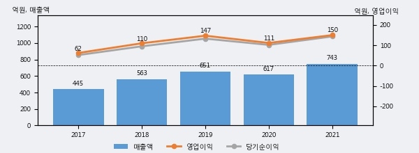최근 실적을 살펴보면 2021년 매출액이 최근 5년 중 가장 높은 실적을 기록했음을 알 수 있다. 이전 최고 실적이었던 2019년 보다도 14.1%(91억 8천만원) 늘어난 것으로 나타났다.