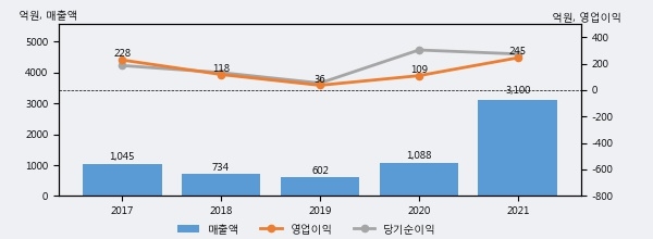최근 실적을 살펴보면 2021년 매출액이 최근 5년 중 가장 높은 실적을 기록했음을 알 수 있다. 이전 최고 실적이었던 2020년 보다도 185.0%(2012억 5천만원) 늘어난 것으로 나타났다.